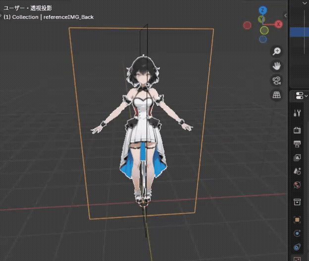 リファレンス画像とは、モデリング時に形状やプロポーションの目安とするための「お手本画像」のことです。特にキャラクター制作では正面・側面・背面の三面図を配置することで、リファレンス画像を視覚的に意識しながらモデリングが可能になります。