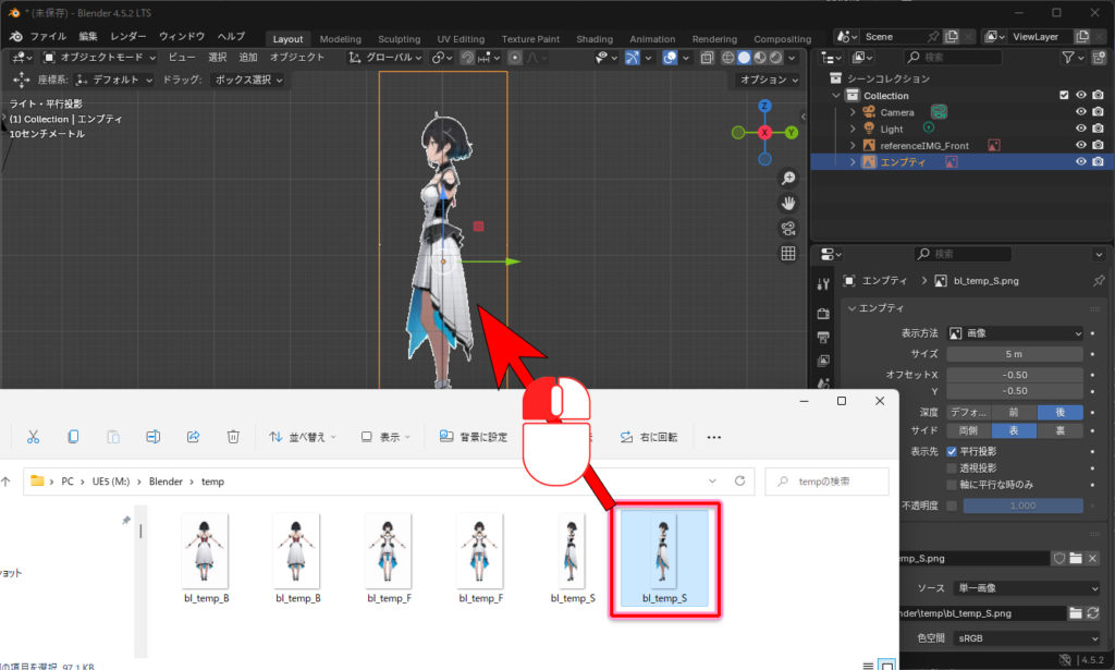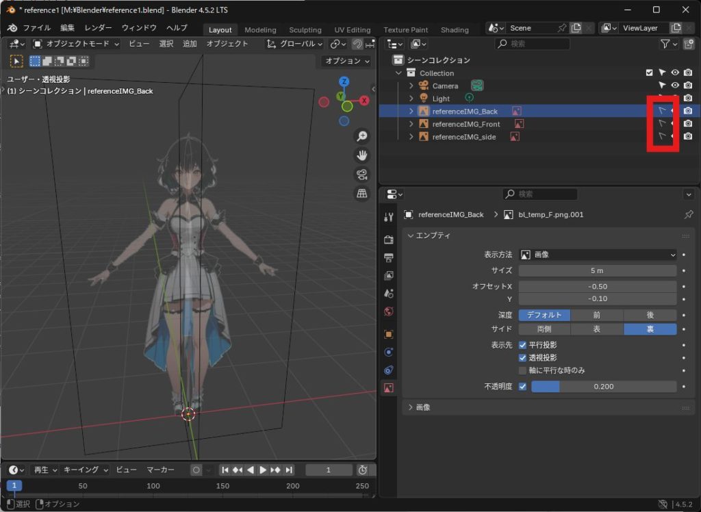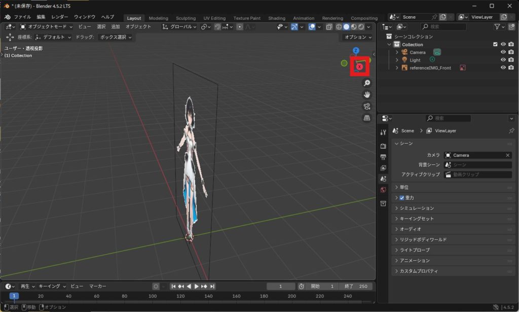 キャラクターモデリングを始める前に、三面図(正面・側面・背面)のリファレンス画像を配置すると作業がスムーズになります。ここではBlender4.5を使って、リファレンス画像を3Dビューに追加する方法を紹介します。