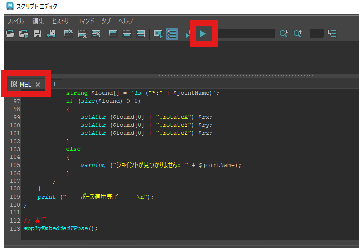 MELのタブにスクリプトをペーストします実行ボタンをクリックします