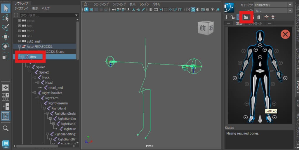 Hipsを選択した状態でスケルトン定義のロード(フォルダのアイコン)をクリックします。