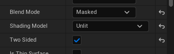 まず、UE5のマテリアルエディタで新しいマテリアルを開き、以下の設定を変更します。