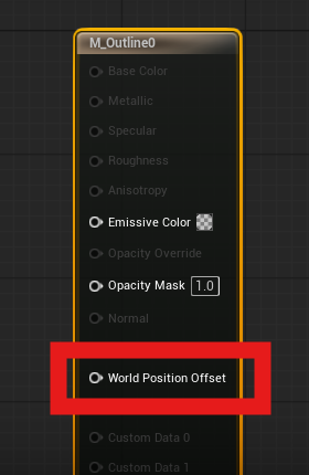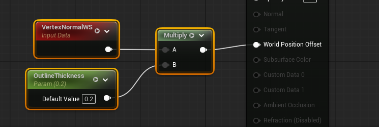 VertexNormalWSの出力をMultiplyの入力(A)へ。OutlineThickness(線幅パラメーター)の出力をMultiplyの入力(B)へ。Multiplyの結果を、マテリアルメインノードのWorld Position Offsetピンに接続します。