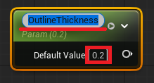 Scalar Parameterノードを配置し、名前を OutlineThickness(アウトラインの太さ)とします。Default Value(初期値)を0.2程度に設定しておきましょう。
