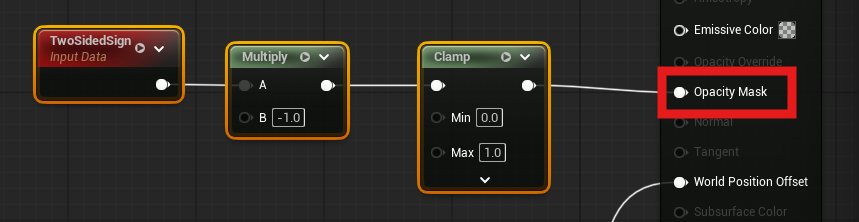 Clampノードの出力を、メインマテリアルノードのOpacity Mask(不透明マスク)ピンに接続します。