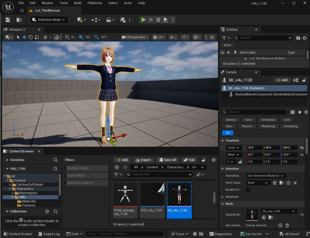 - キャラクターアクターを選択: レベルに配置されているキャラクター(スケルタルメッシュ)を選択します。