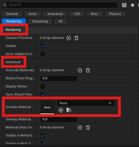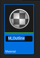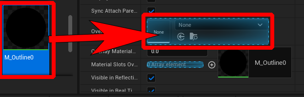 Overlay Materialスロットに、作成したアウトラインマテリアル (M_Outline) をドラッグ&ドロップで設定します。