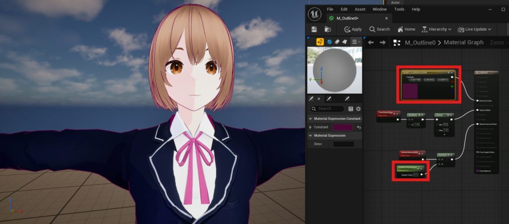 OutlineThicknessの値を少しずつ変えて、一番格好良い線の太さに調整してみてください。Constant3Vectorの値を変更して、アウトラインの色を変更してみてください。